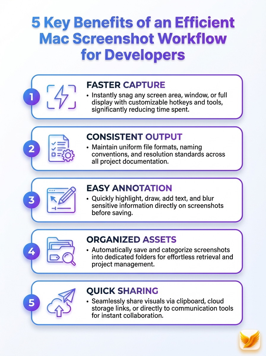 Five key benefits of an efficient Mac screenshot workflow for developers are highlighted. The infographic outlines practical steps, tools, and expected outcomes.